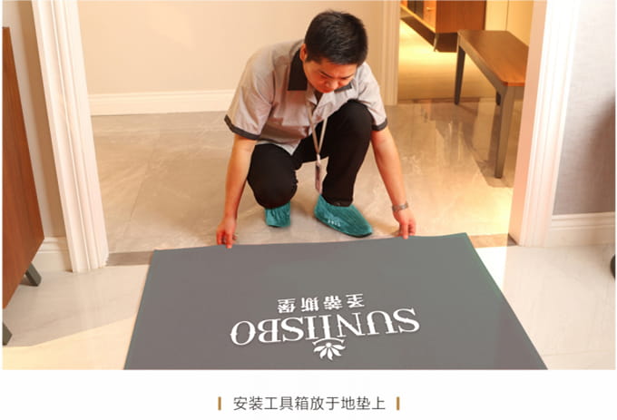 1、征得客户同意后在客户指定地点进行产品安装,安装过程中将提前准备好的小地毯/地垫放置于地上,安装工具箱放于地垫上,不要在家具或地板上乱放,以免散落面板或地面上造成磨损。
