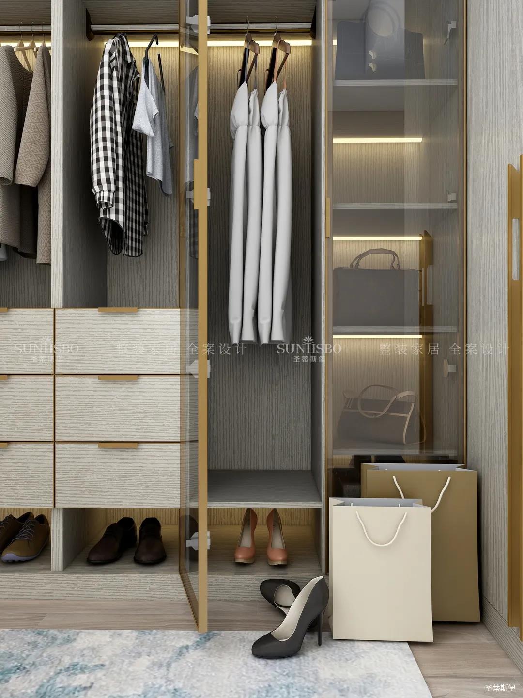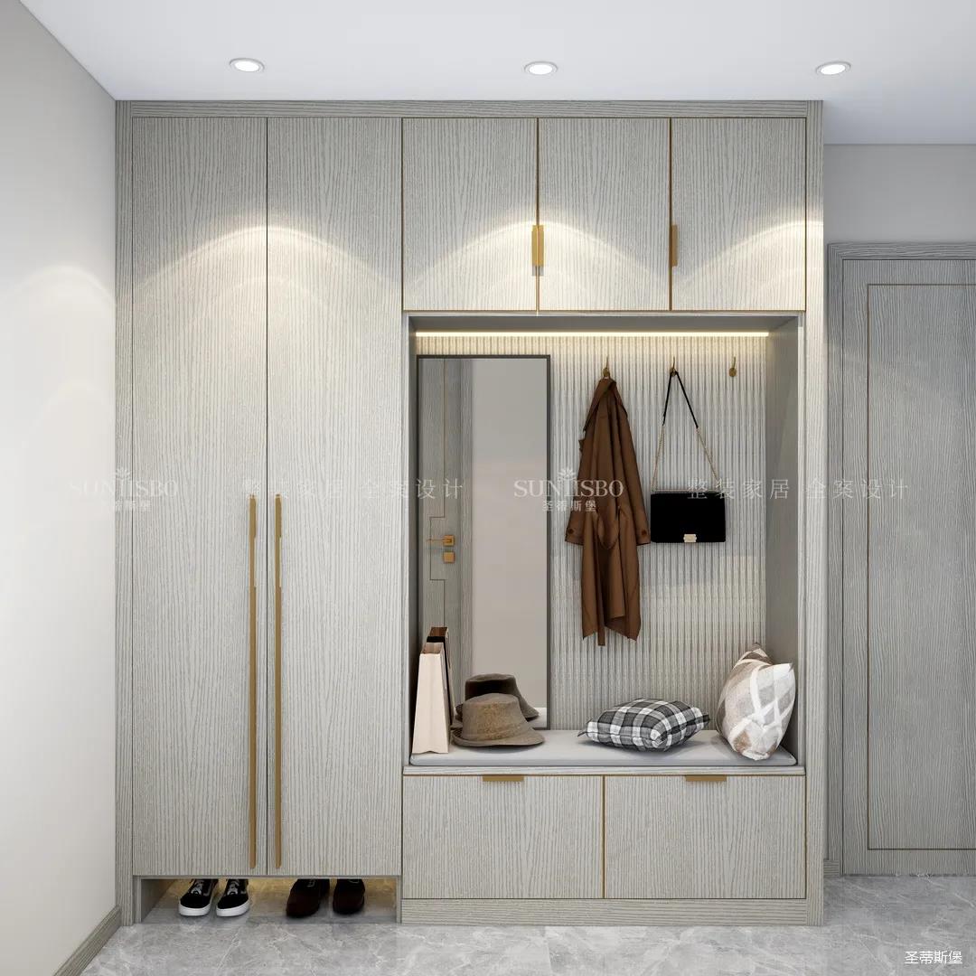进入玄关区域就能感受到房主对时尚风格的偏爱,实木元素与简奢金属的碰撞,既有对材质的甄选,又有现代简奢的品质感。穿衣镜、换鞋凳、收纳柜等藏漏有序的分区,将屋主的生活归纳的井井有条。